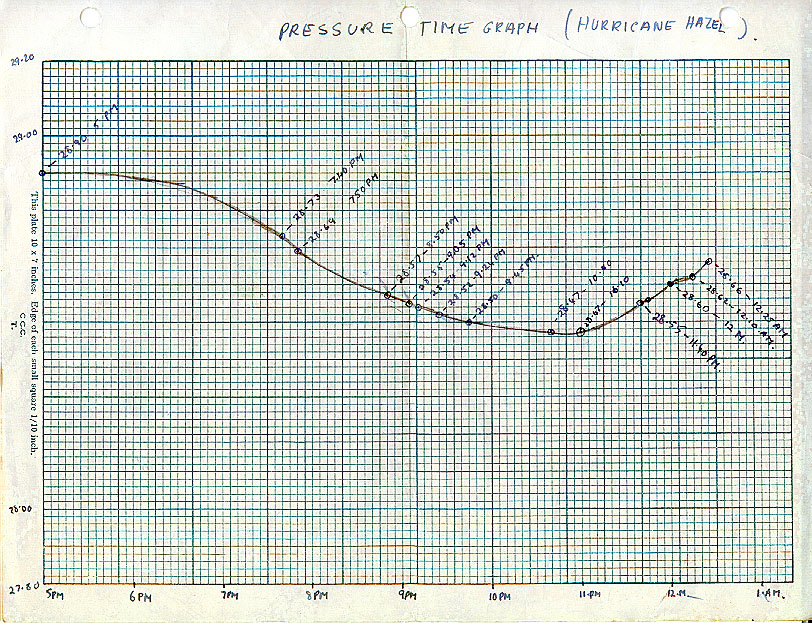 Here is a graph recorded by my brother Vincent Taylor during the evening of Hurricane Hazel, showing clearly that the eye passed over Weston (northwest Toronto, now) about 11:00 pm. There was a drop of about 0.4 inches of mercury in the preceding 5 hours.