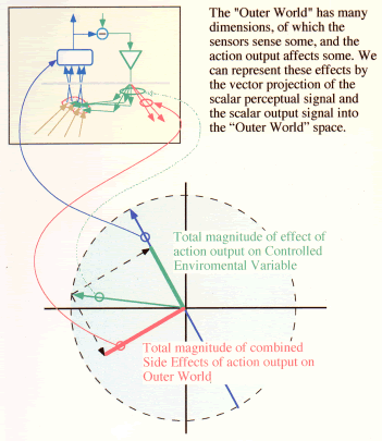 These relations are shown in the circular figure. The vector representing the ci is the blue arrow.The vector representing the ai is the green arrow point leftward. The part of the output that affects the controlled perception (ai,...al) is shown by the green bar laid along the blue arrow, and the wasted output that affects the rest of the Outer World (am,...an) is the red bar orthogonal to the blue arrow. The red bar represents the side-effects. Optimally, all the am,...an are zero--that is, there are no side effects and all the energy of the output (represented by a1,...,ak) is used to oppose the disturbance.